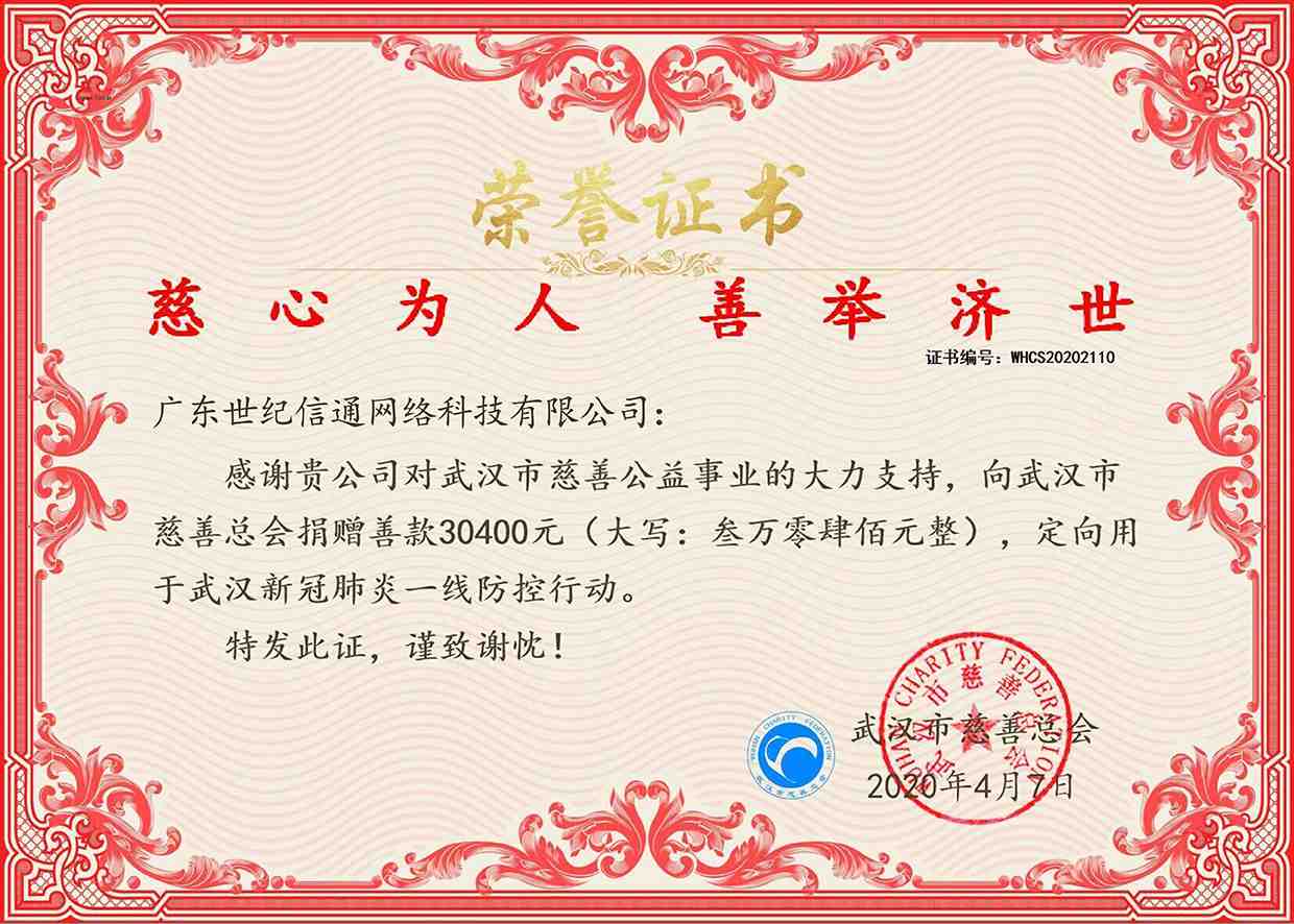 广东世纪信通公司爱心捐款武汉市慈善总会